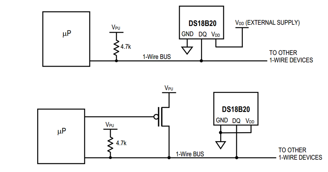 •若此总线的从机采取寄生供电,则主机还应配一个强上拉输出电路