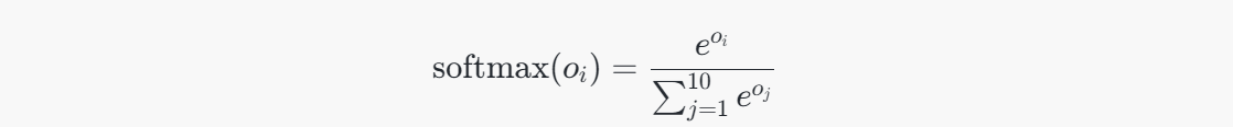 在得到长度为10的向量后,通常会将其通过激活函数进行处理。在分类任务中,输出层通常使用 Softmax 函数,将每个输出值转换为概率值。Softmax 函数公式为: