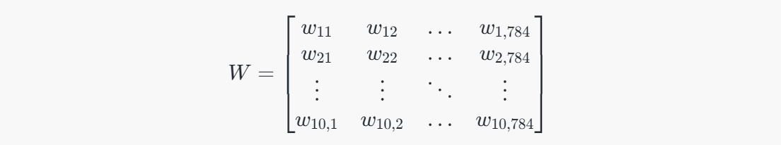 权重矩阵 WW 是一个 10×78410×784 的矩阵: