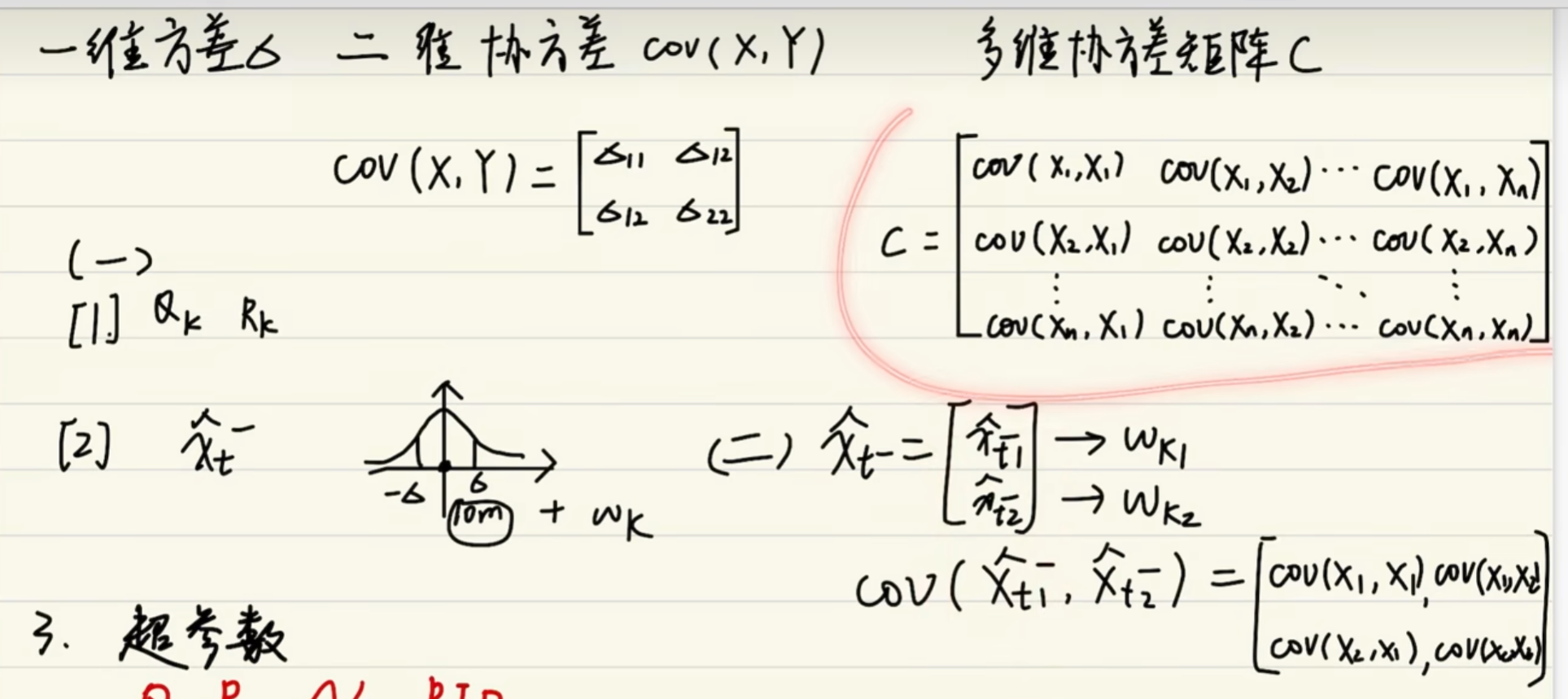 • 作用:描述系统模型中的不确定性,即状态变量(如位置和速度)随时间演变时引入的随机波动。