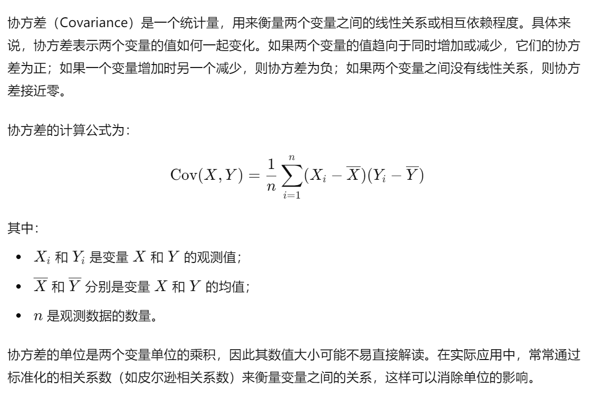 • Cov(X,X)Cov(X, X) 是 (X) 的方差,表示 (X) 自身的波动程度。