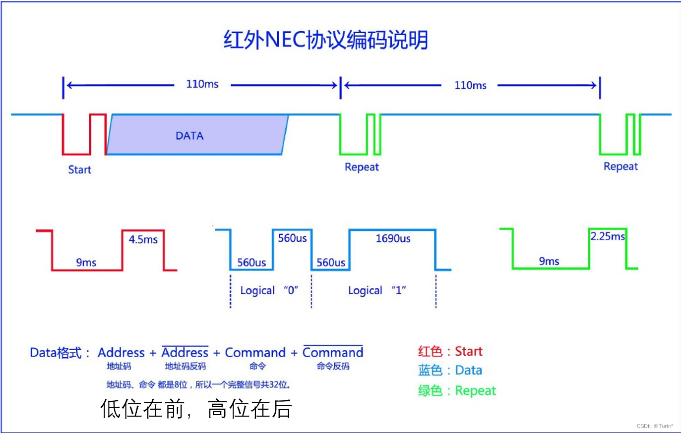 NEC编码包括地址码和命令码,其中地址吗和命令码都会进行一次反码校验。因此,一段完整的NEC数据码一共有4个字节,32位bit