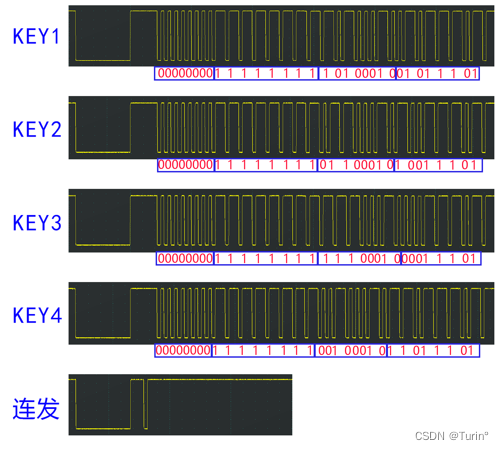 这里,我们定义地址码为Address,命令码为Command, 完整的数据码为DATA,如果我们按下0,那么发送的Address=0x00; Command =0x16; 那么DATA一共包含0X00,0XFF,0X16,~0X16四个字节的先后数据。